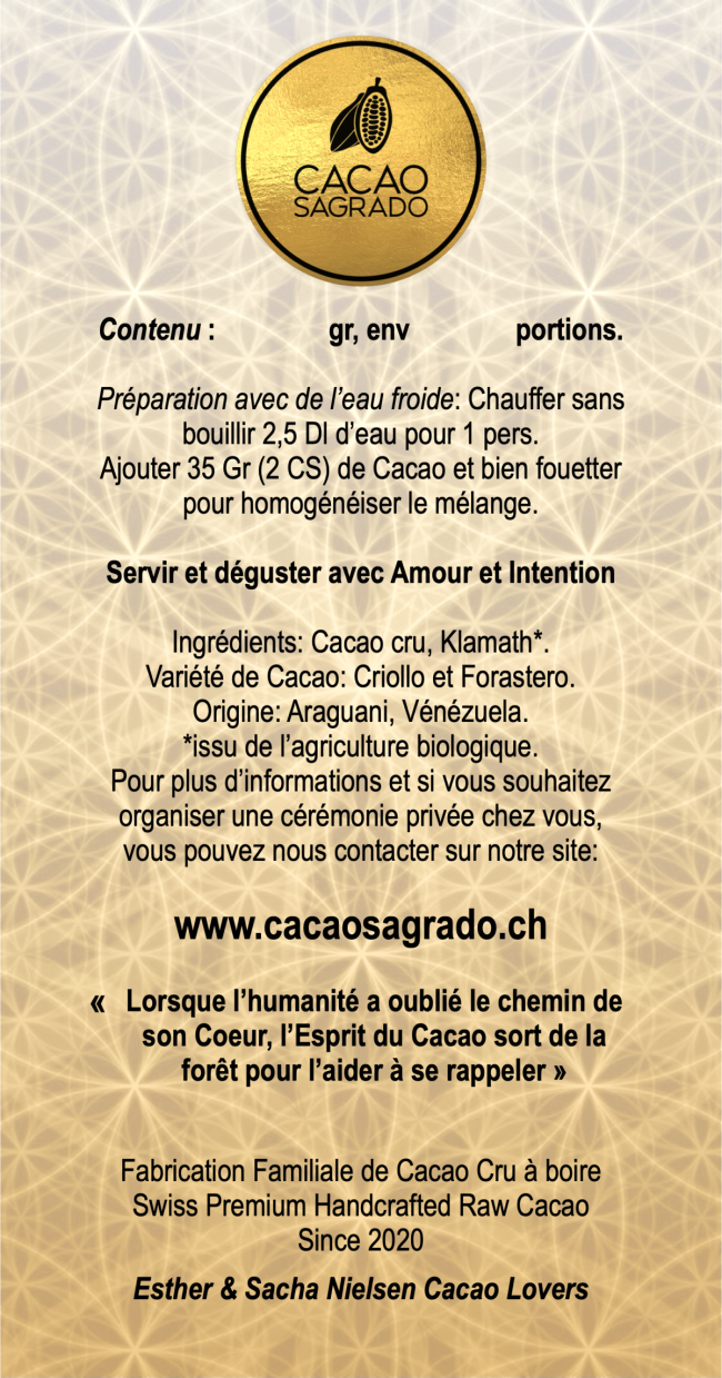 L’esprit du Cacao est l'une des divinités les plus puissantes de la cosmologie Maya, ils l'ont appelé "Ku-Ku" qui signifie "Sacré sur le sacré". Le cacao a été cultivé par cette culture pendant 2500 ans. Préparée selon une recette secrète, vieille de plus de 600 ans, qui nous a été enseignée par nos ancêtres Mayas, le Cacao est la porte pour faire un voyage dans notre monde intérieur et ce sentir plus connecté à notre centre/racines/coeur.