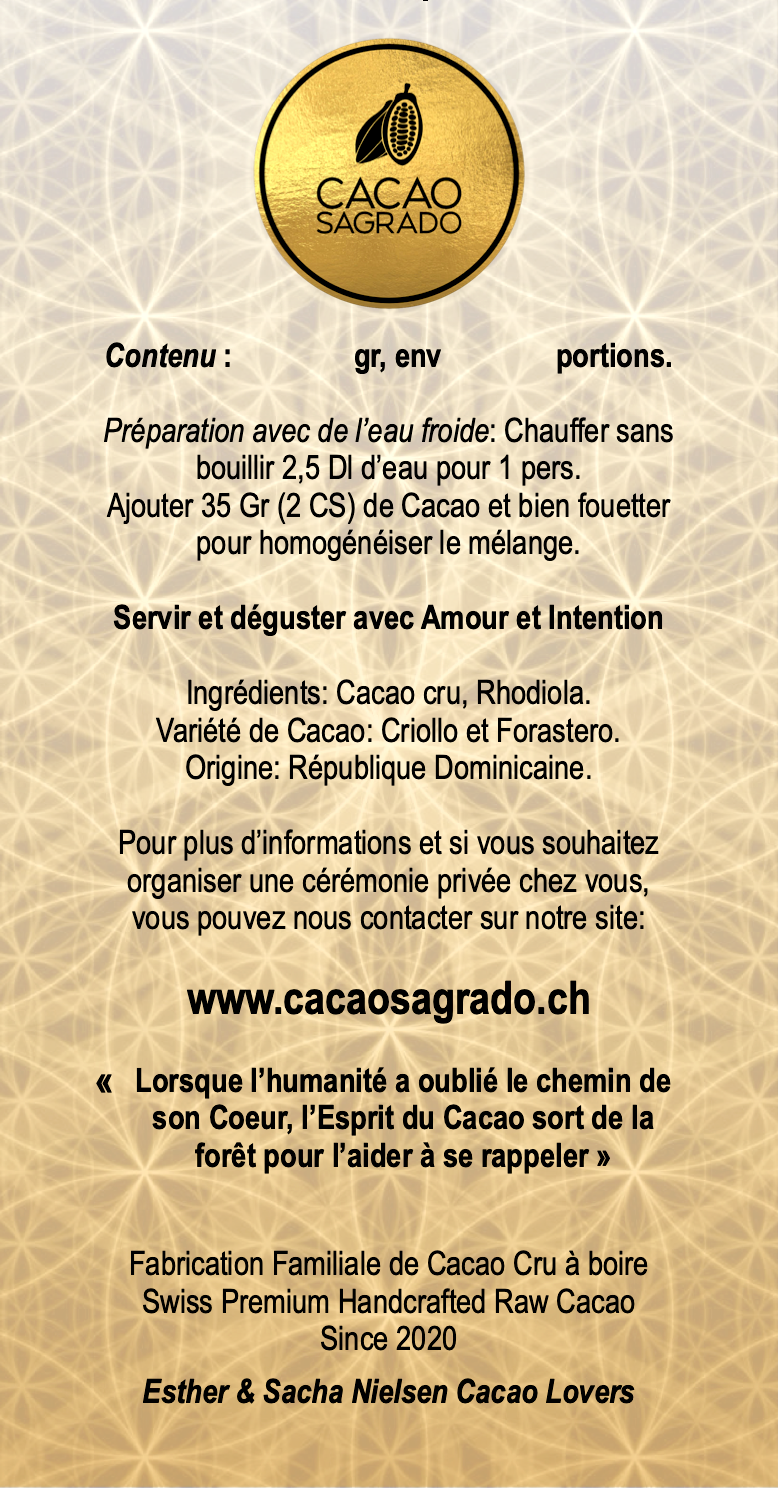Dans sa forme actuel, le rituel du Cacao est appelé Cérémonie de Cacao Sacré, d’où le nom Cacao Sagrado. Elle est une interprétation contemporaine du rituel ancestral lié au rites des cultures pré-Colombienne.